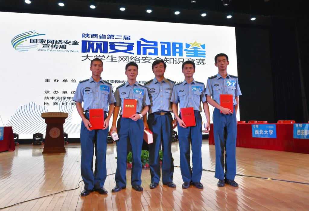 2017年9月22日,陕西省第二届“网安启明星”大学生网络安全知识竞赛总决赛在西安交通大学兴庆校区举行,由我校网络中心靳豪杰教员带队,翁攀、郭志华、朱福帅、乐献志4名本科学员参加的空军军医大学参赛队经过初赛,复赛,决赛,在全省高校参赛队中脱颖而出,一举获得第一名。